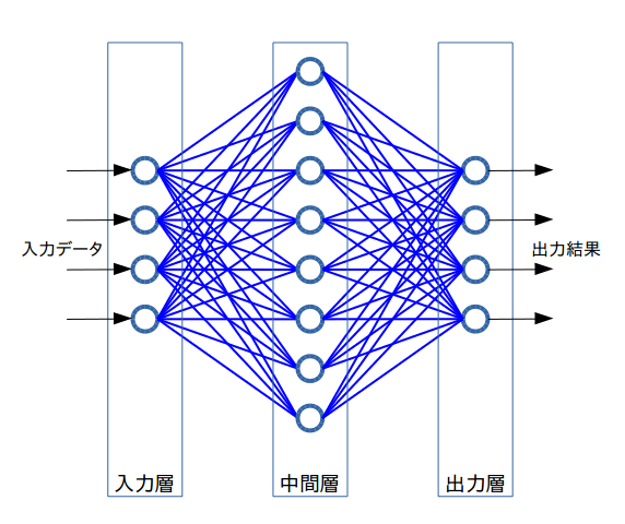 たとえば下図は中間層をひとつ持ち、入力層と出力層がある、3層のニューラルネットである。