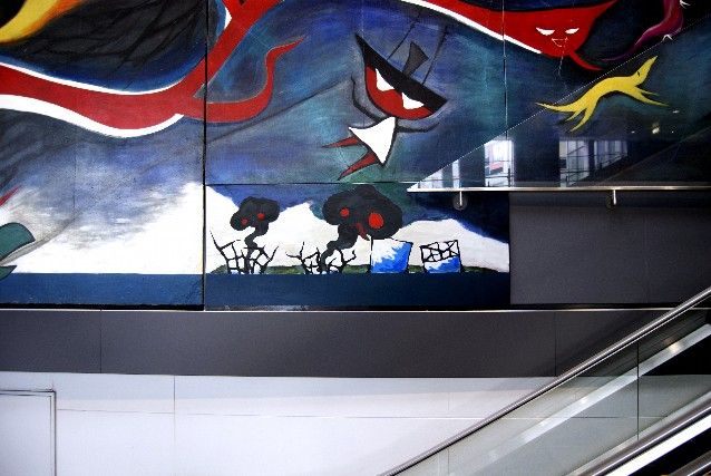 渋谷に掲げられている岡本太郎の巨大な作品、「明日への神話」の横にChim↑Pomが作品を